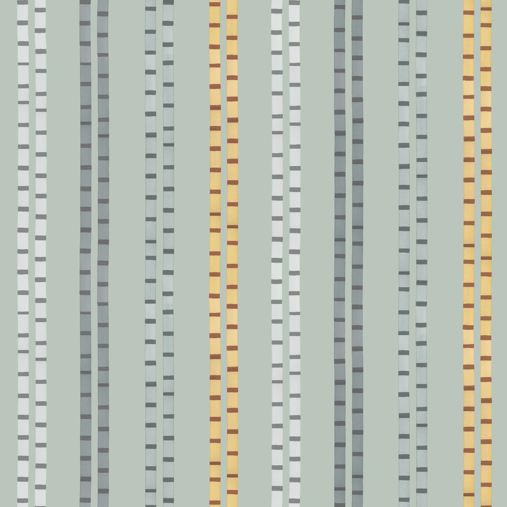 Ground is similar to Farrow+Ball 'Light Blue'. Colour palette is similar to Farrow+Ball 'Oval Room Blue' and Edward Bulmer 'Aerial Tint' and 'Sea Green'.