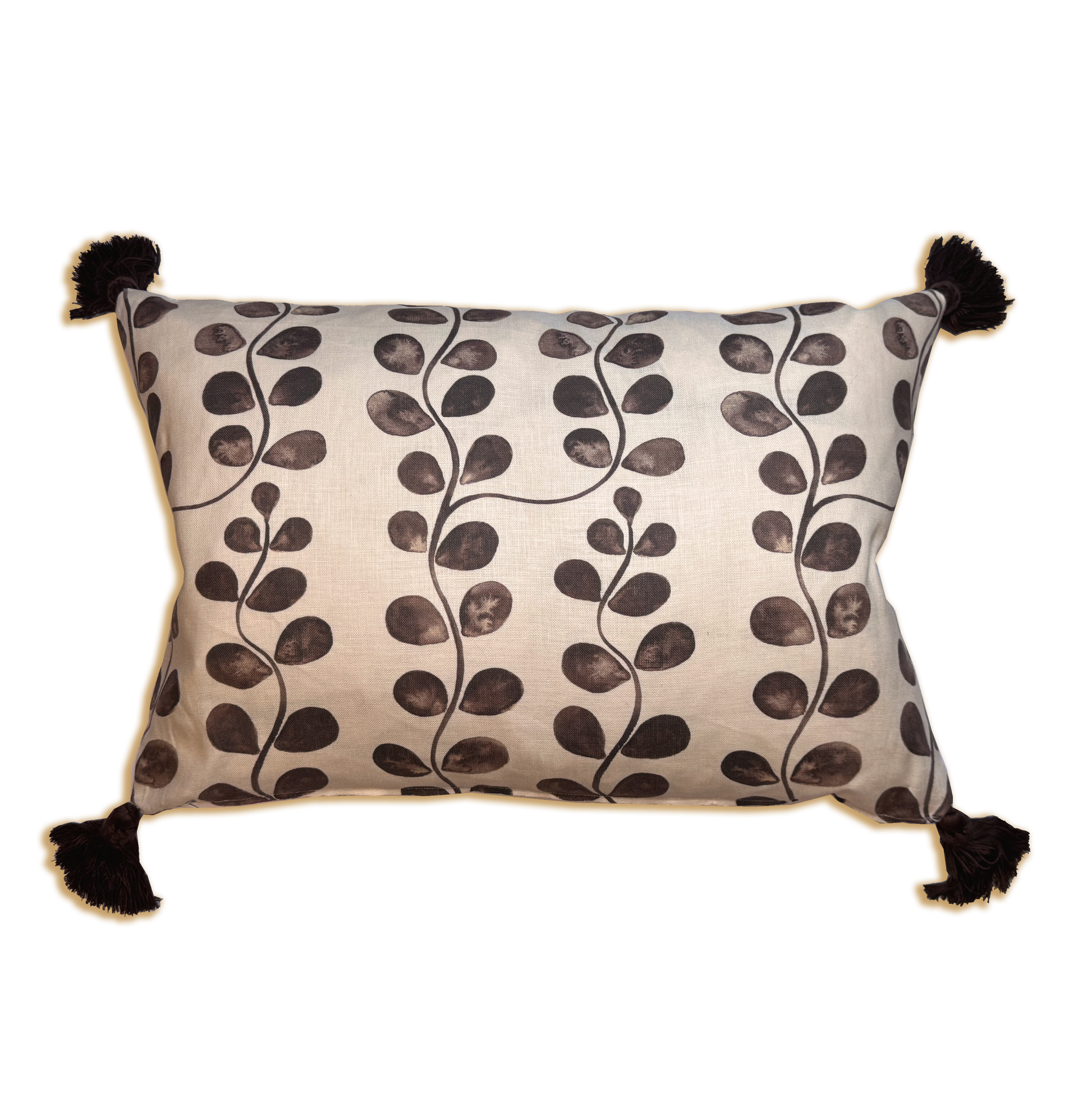 The front of the cushion features our Canopy linen in peat, the back uses the ever-popular New Stripe in cherry and each corner is finished with a brown cotton tassel.